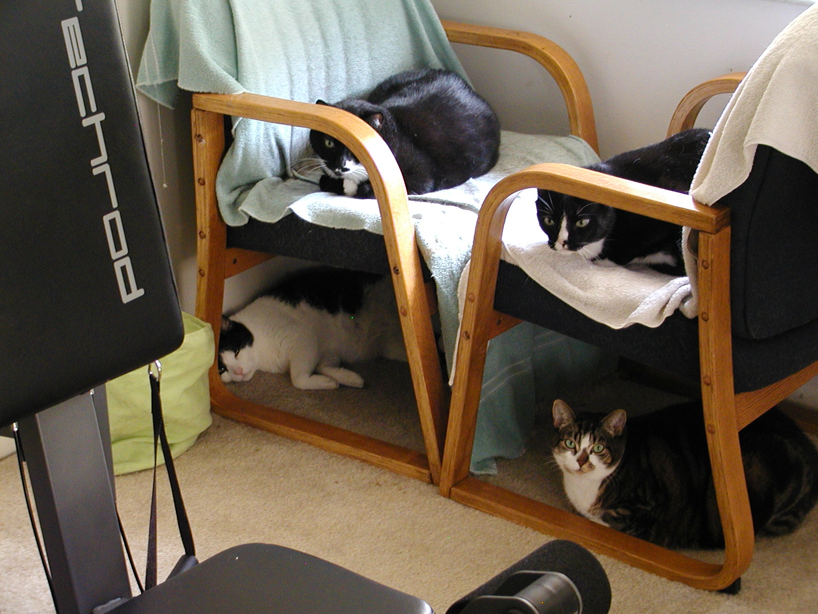 Update: In response to a request from one of the three of you who read this stuff, the names of the cats are: (in approximate relation to their placement)